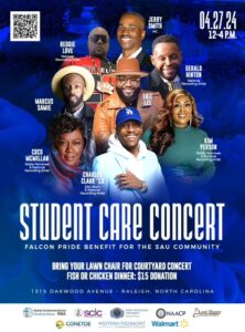 Mark Your Calendars! Bring your lawn chairs to the University Quad this Saturday, April 27th, from 12 - 4 p.m. for a Free Student Care Benefit Concert for the SAU Community, hosted by the Raleigh Interdenominational Ministerial Alliance and various community partners. For more information on how you can help RIMA support SAU, visit https://www.rimaraleighwakeco.org